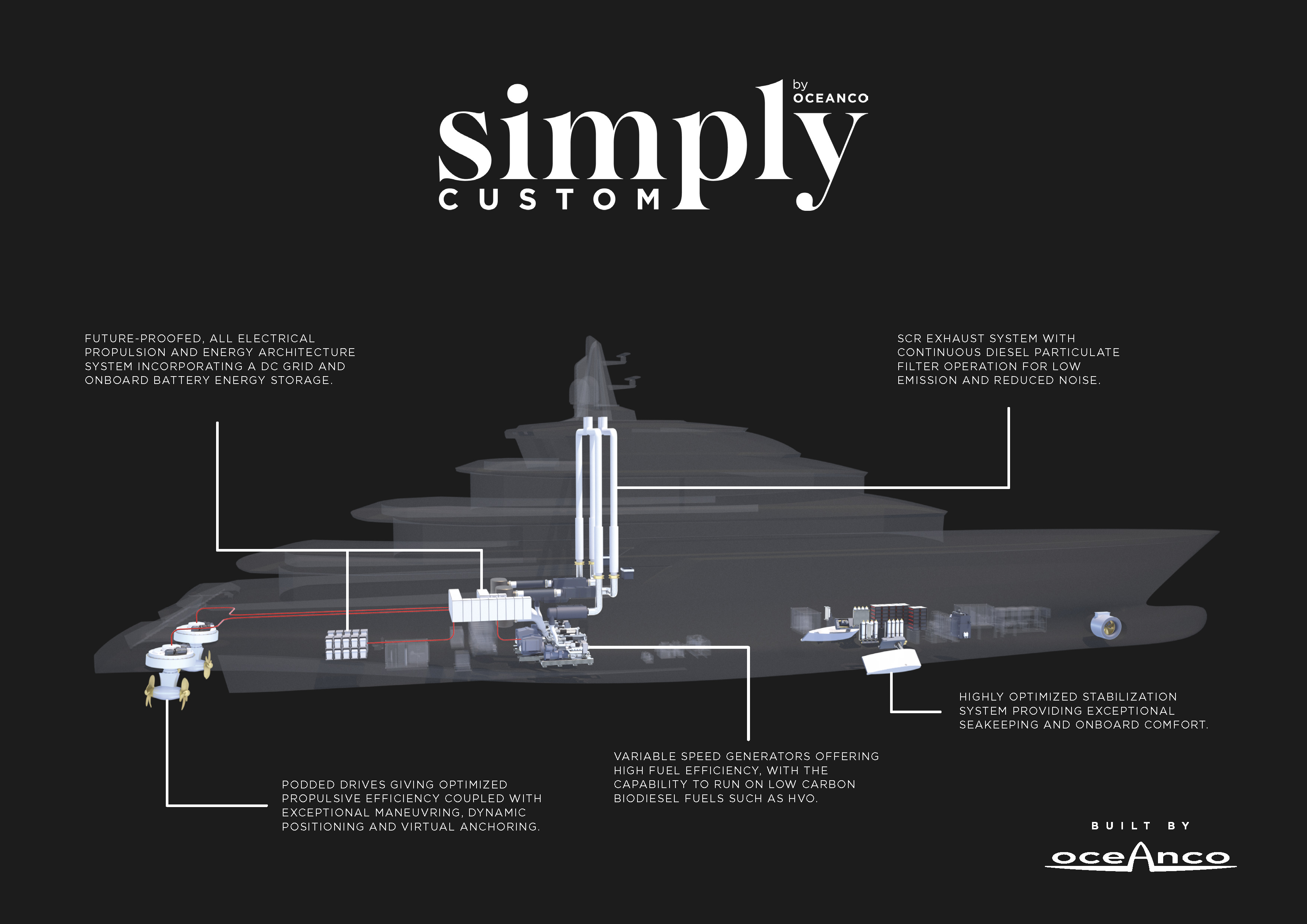 At the core of the Simply Custom technical foundation is an all-electric propulsion system with a DC electrical architecture. Variable-speed generators drive azimuthing thrusters that deliver propulsion efficiency alongside best-of-class maneuverability. Together, this compact but powerful system allows effective, safe and reliable dynamic positioning, with high levels of redundancy. Meaning every Simply Custom yacht is engineered to operate in all conditions, including areas with anchoring restrictions.