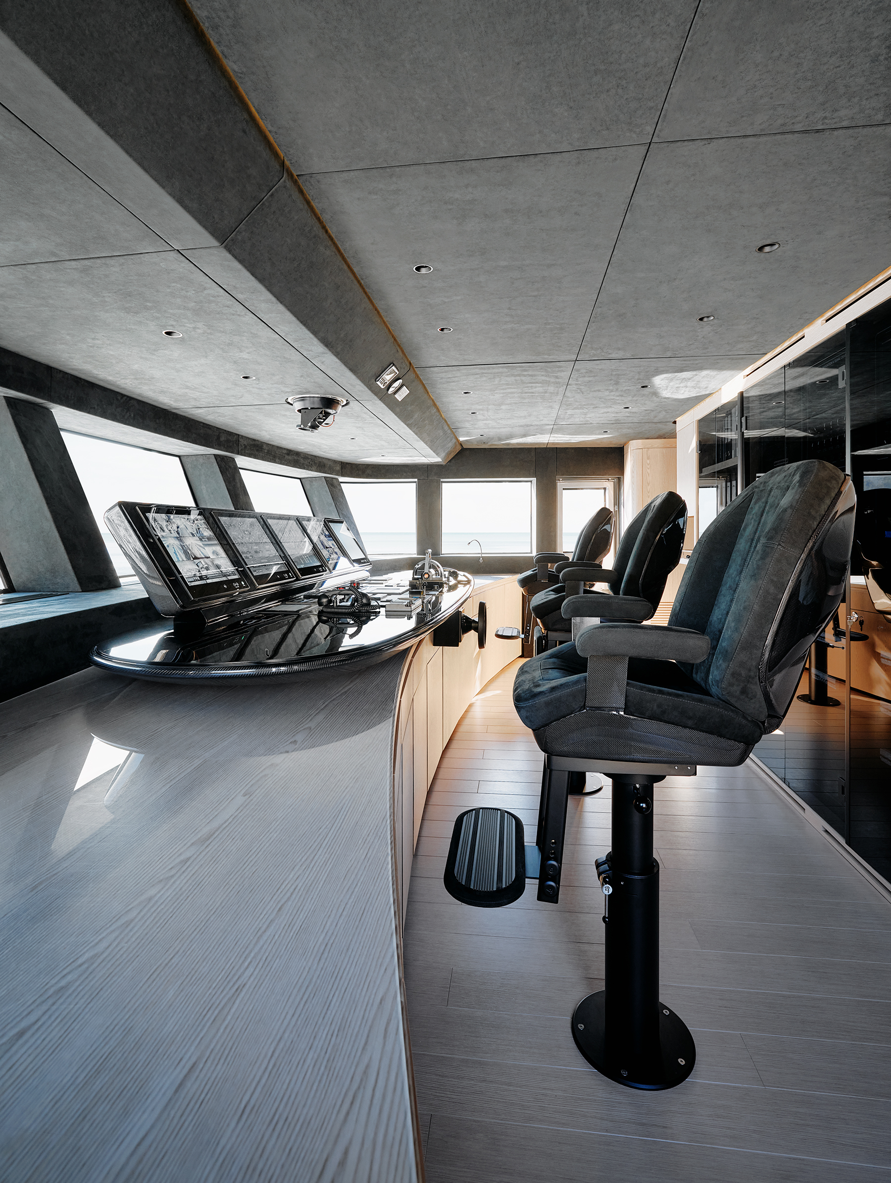 An illustration of that concept is in the wheelhouse, which would usually be on the upper deck on a 185-footer. Instead, the 57Steel has a dedicated bridge deck. This choice frees up real estate on the deck below for a master stateroom overlooking a private foredeck with a hot tub, as well as space for a full-beam VIP on the main deck forward. (Another four staterooms—two twins and two doubles—are on the lower deck, for a total of 12 guests, with quarters for the same number of crew.)