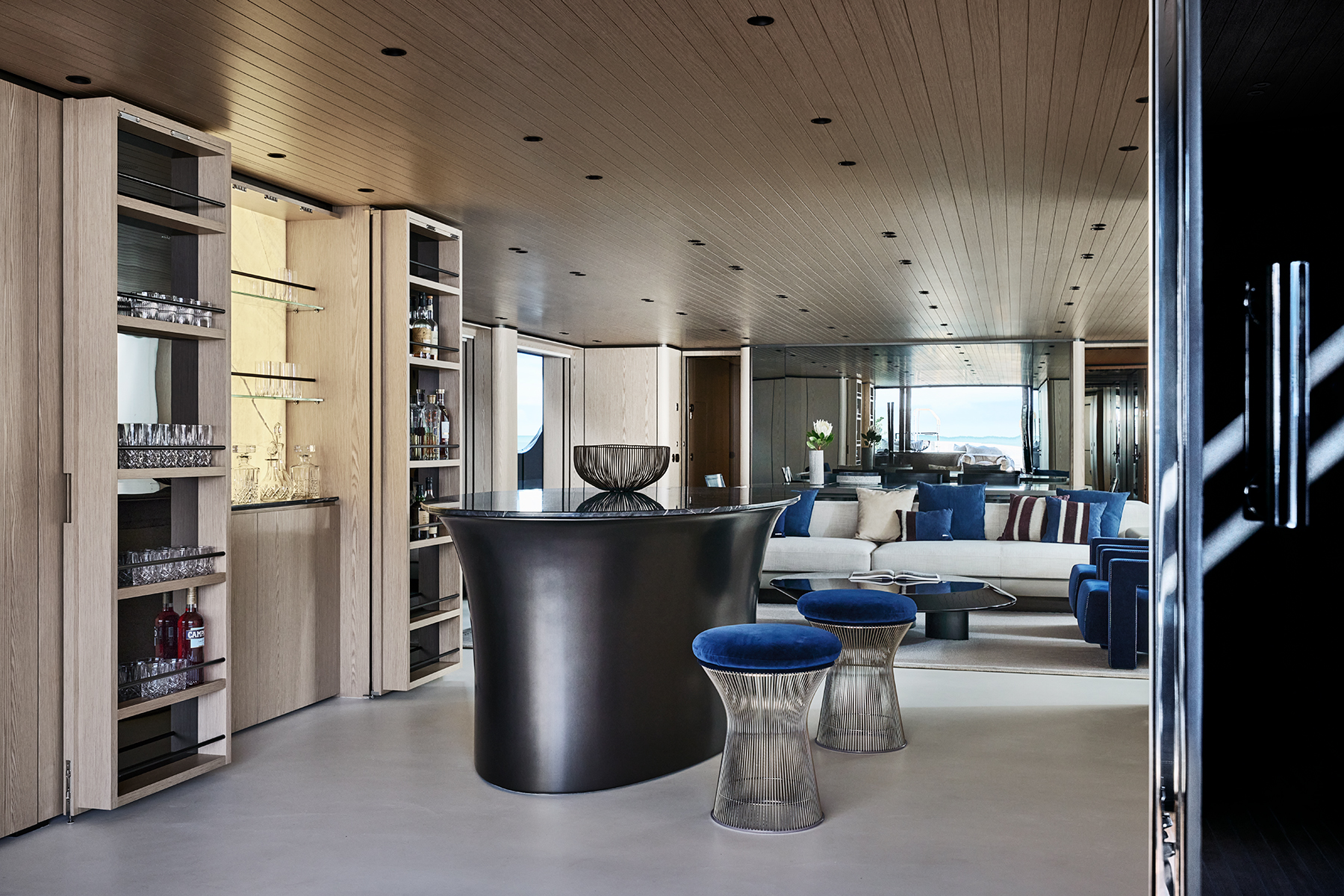 Virtuosity’s 1,050 gross tons of interior volume are felt most in the main salon and dining room. She is about 16 feet (4.8 meters) longer than the 52Steel, but seems far bigger with twice the interior volume, a beam of almost 36 feet (10.9 meters), full-height windows and freestanding furniture. A bar at the entrance to the main salon makes use of the space between the engine room ventilation shafts. It is ideally placed for serving the aft deck lounges and glass-bottom pool, which allows light to filter into the beach club below.