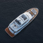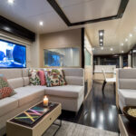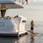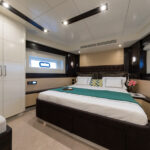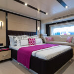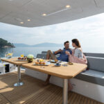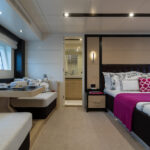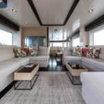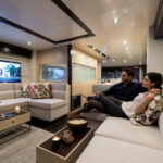 She has superyacht-style features, too, such as a hot tub with a couch, table and sunpads beneath an awning. The full-beam master stateroom has 6 feet, 8 inches of headroom; its king-size berth has a buttery-soft Italian leather headboard; and its bathroom spans the beam with a double-wide vessel sink, a head with bidet, and a shower with seating for two.
