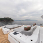 The flybridge deck aft can handle four teak-and-canvas sun lounges and still leave space for a sink, grill and fridge.