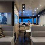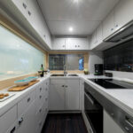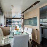 The salon has a dining area with seating for six opposite a semi-enclosed galley. A glass panel aft separates the galley from the twin couches in the living area, and a removable frosted panel on the inboard side can hide the galley, which has an opening window, a Miele fridge and an induction three-burner cooktop with oven.