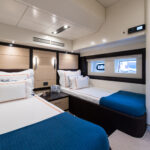 The VIP stateroom forward has an island king berth and ensuite head. Also off the lower foyer is a third ensuite guest stateroom, this one with twin berths. A day head is behind a foyer door.