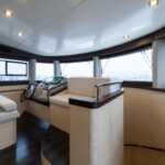 The flybridge, which extends over the side decks (providing shade for the salon windows) is another surprise for a 64-footer, with a settee and table opposite a console that has a swing-out counter for buffet service. The helm has twin Stidd seats and a lordly view of the world, and a sunpad opposite. A fiberglass hardtop with an opening sunroof covers this whole area.